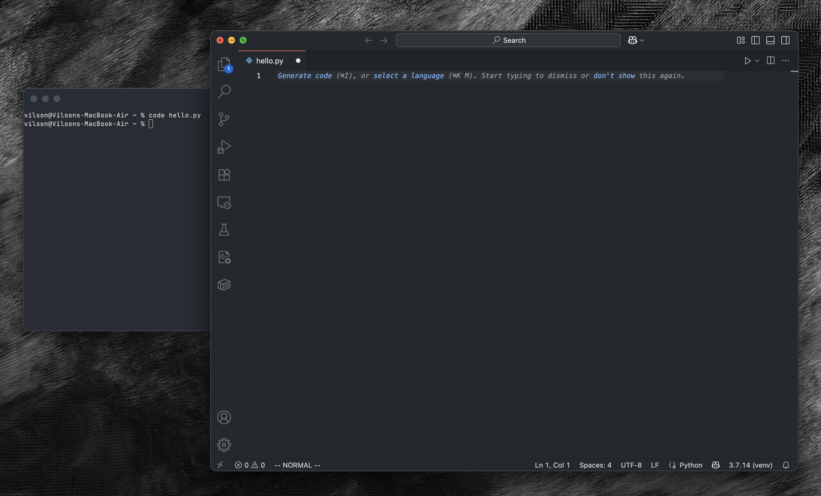 Then, go back to your terminal and type: code hello.py. This should run VS Code and open an empty file called hello.py, like this: